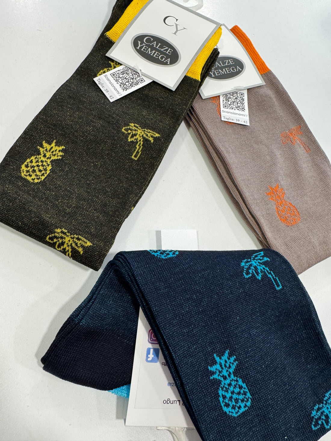 Calza da uomo in filo di Scozia makó elasticizzato, fantasia ananas, polsino francese, calza rimagliata
