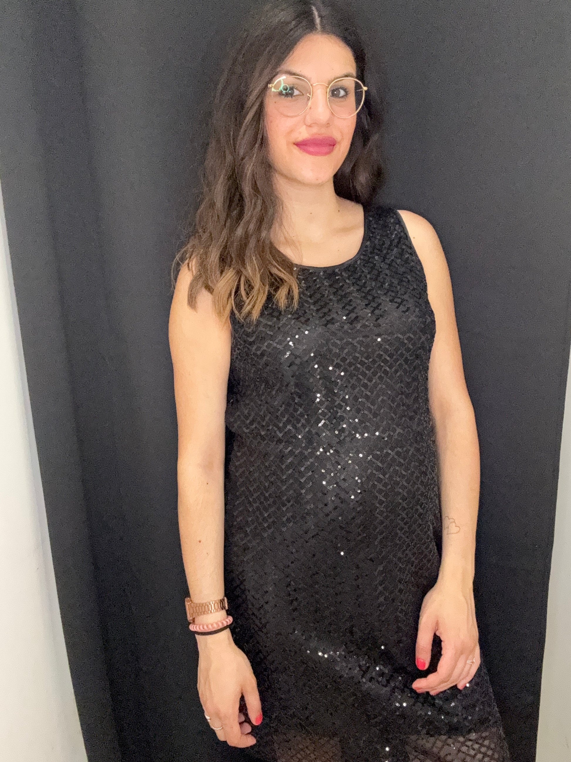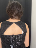 Abito corto con trama paillettes, scollatura particolare sul retro, foderato
