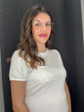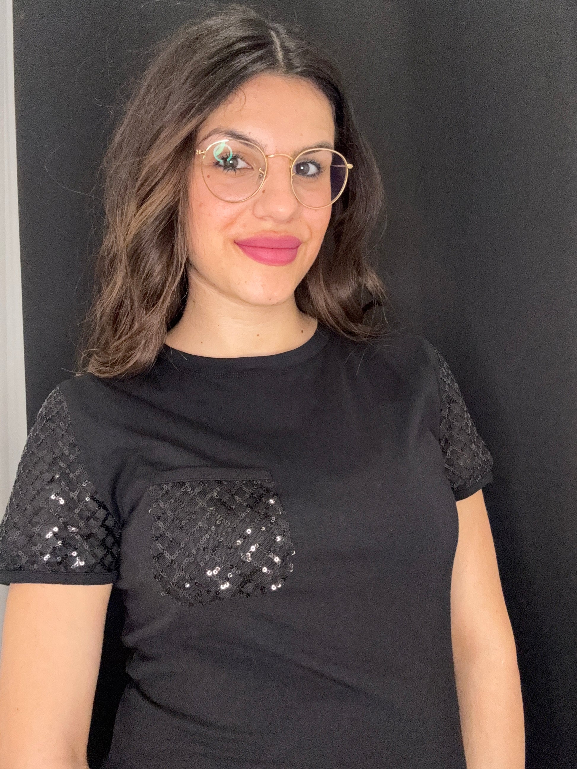 T-shirt girocollo con taschino e maniche in paillettes in cotone