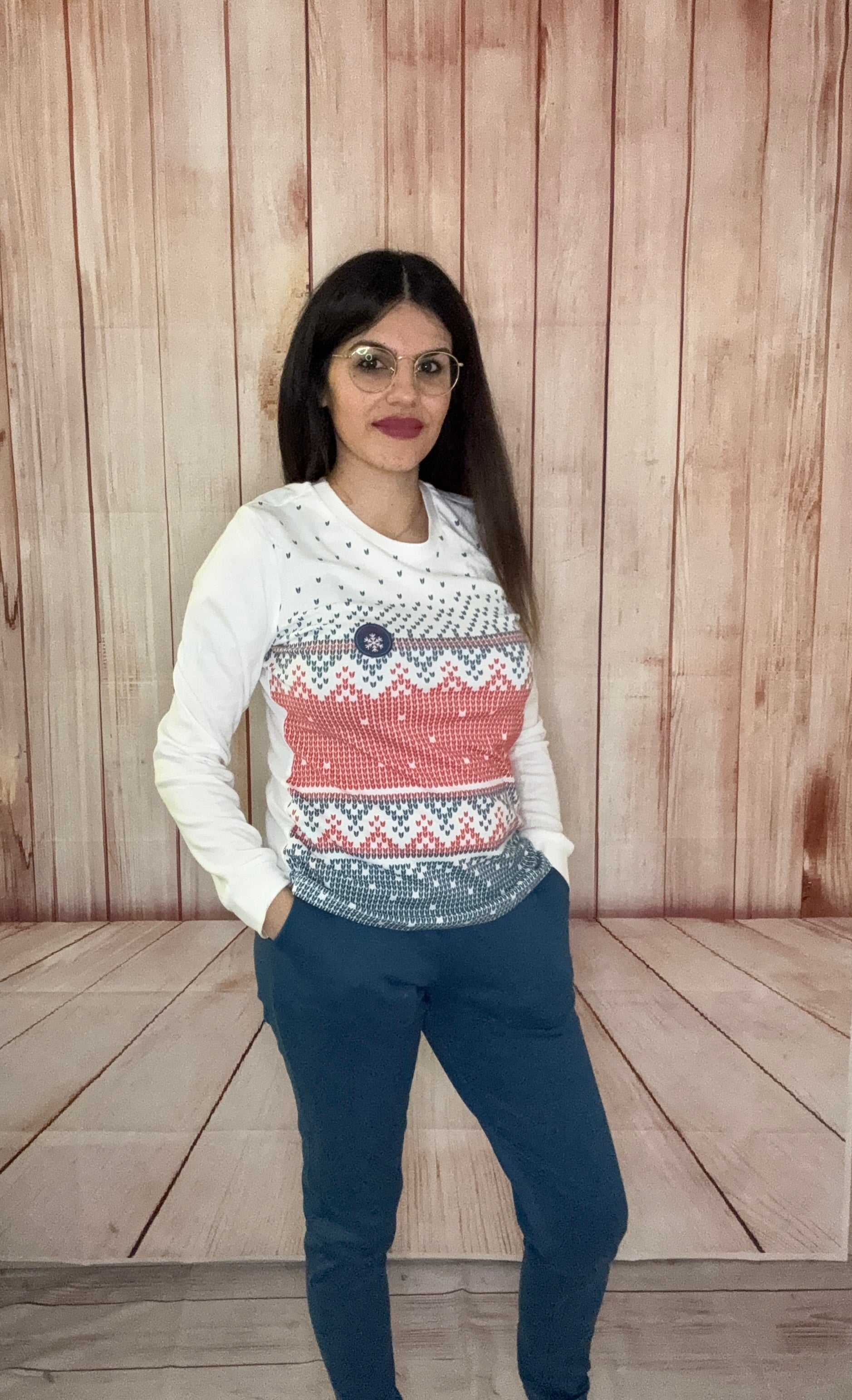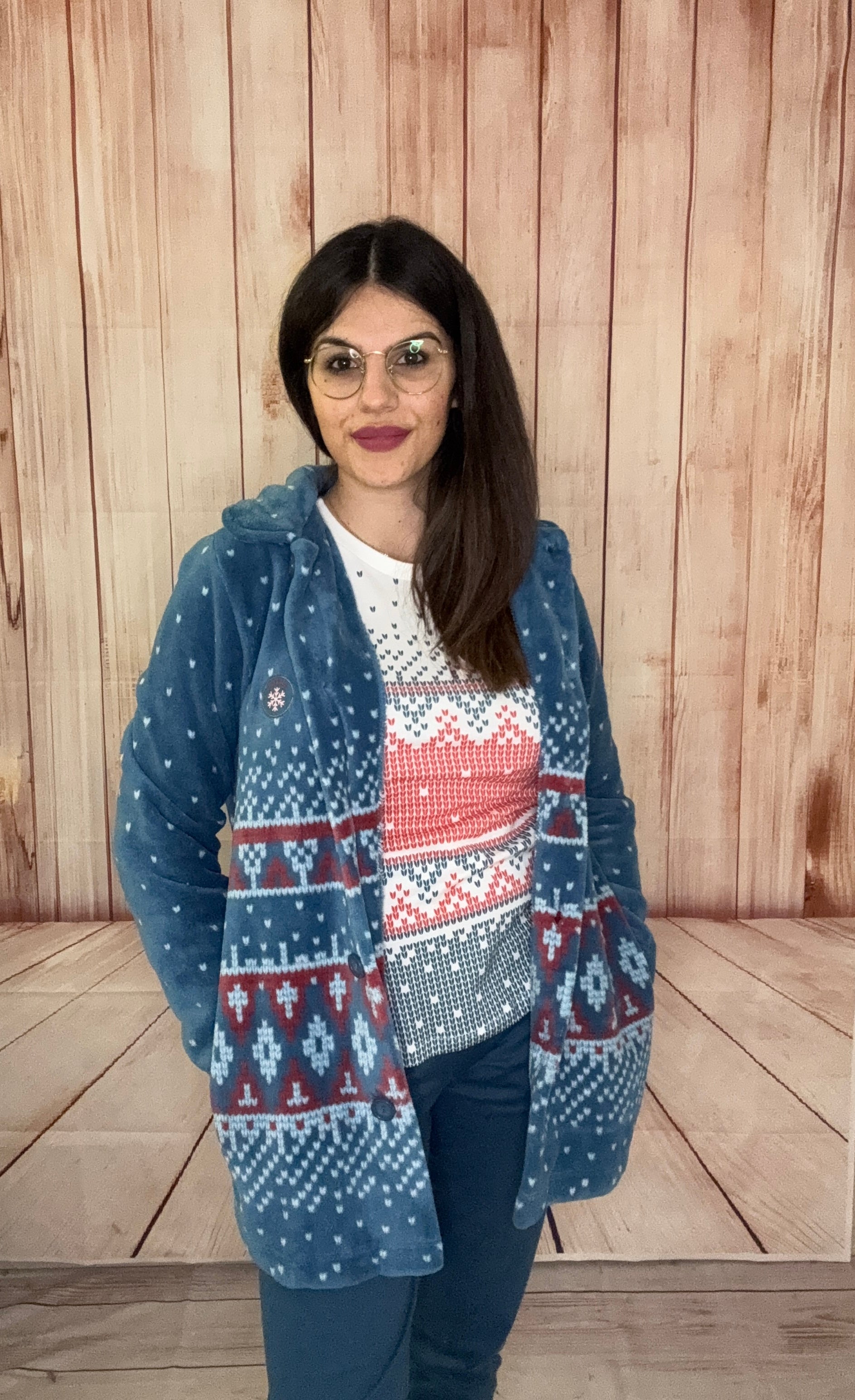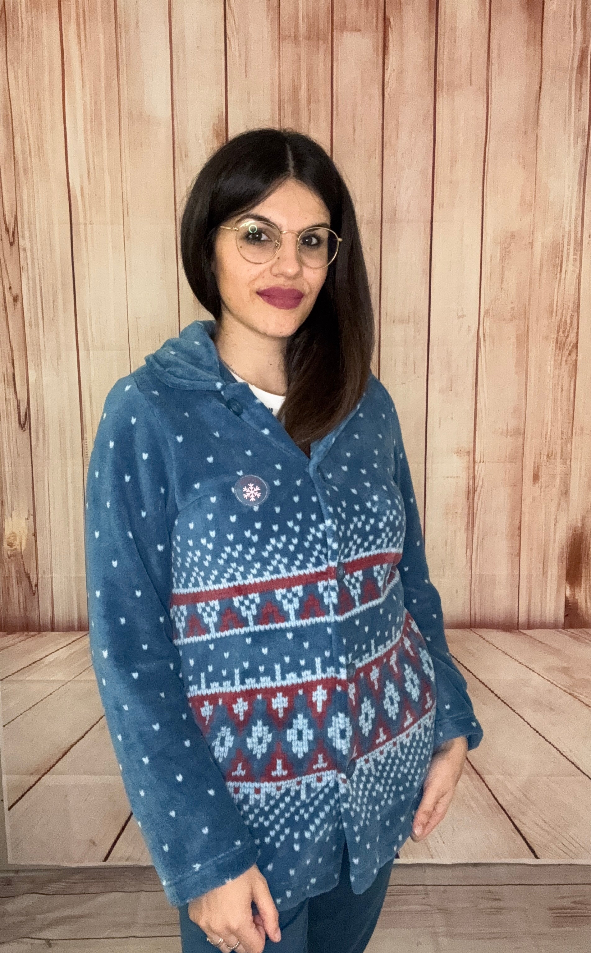 Pigiama 3 pezzi in caldo cotone, maglia manica lunga caldo cotone girocollo, pantaloni in caldo cotone con polsino e tasche, giacca da camera in coral