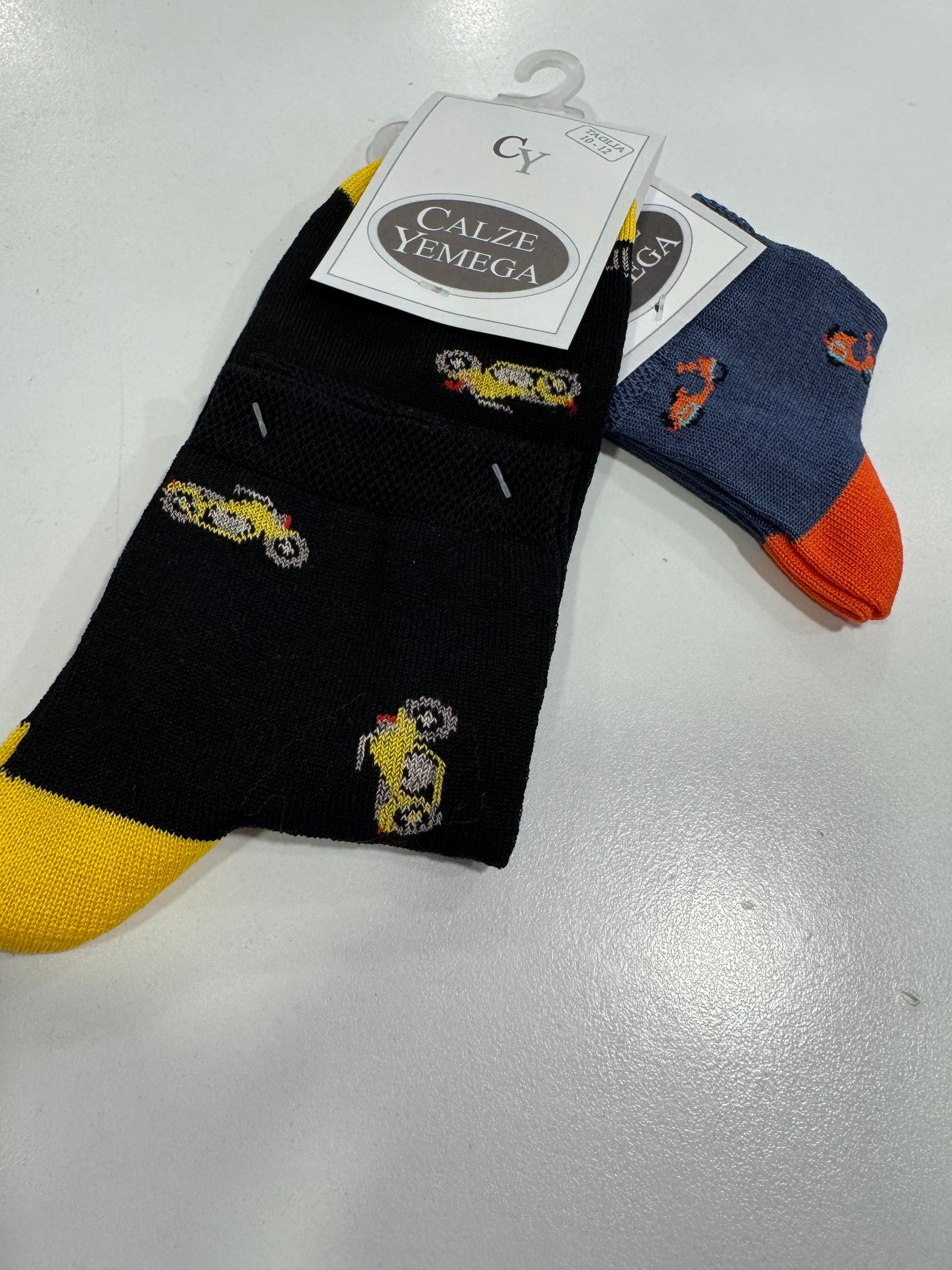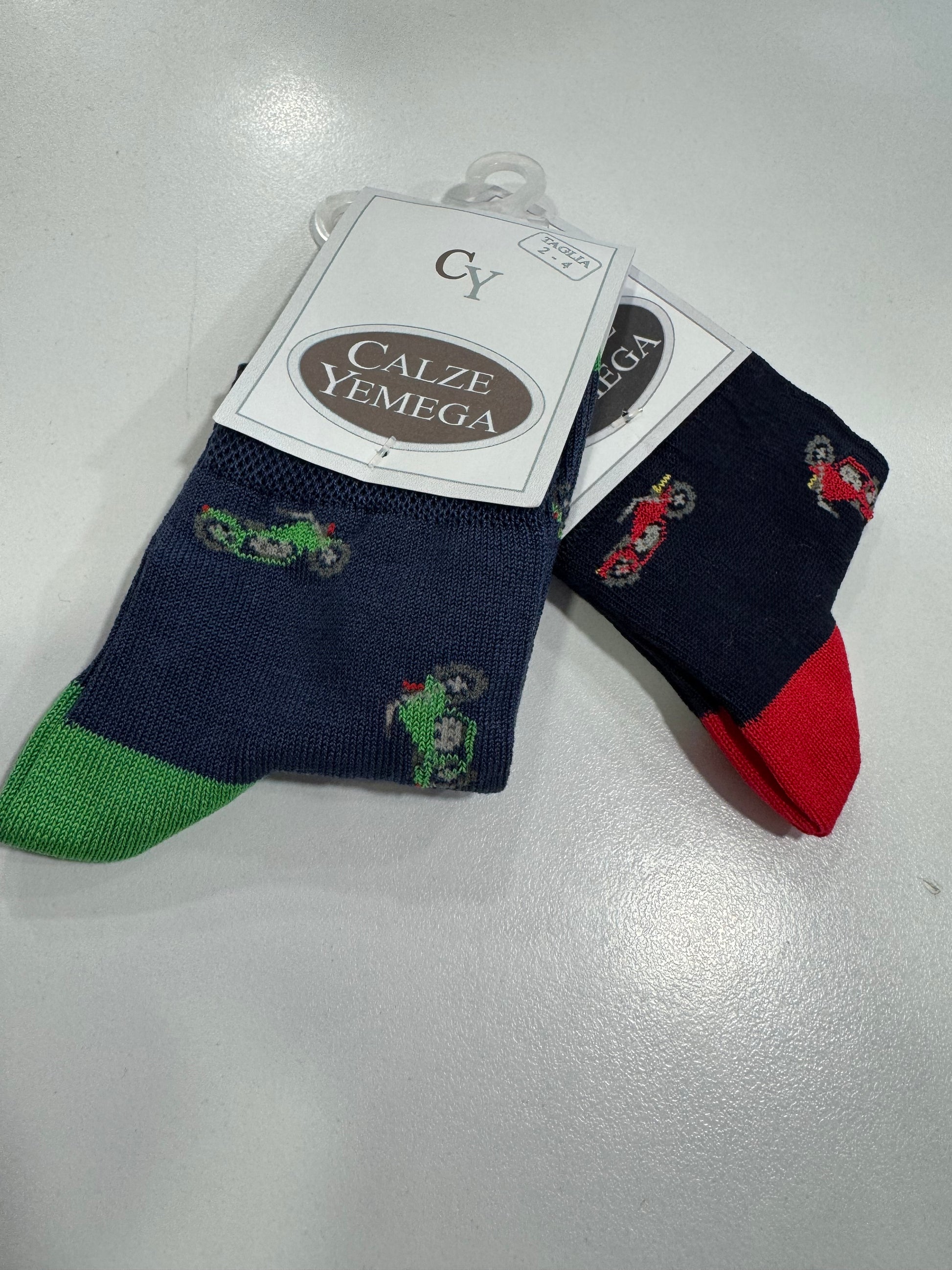 Calza da bimbo in filo di Scozia makò elasticizzato, fantasia moto, polsino francese, calza rimagliata